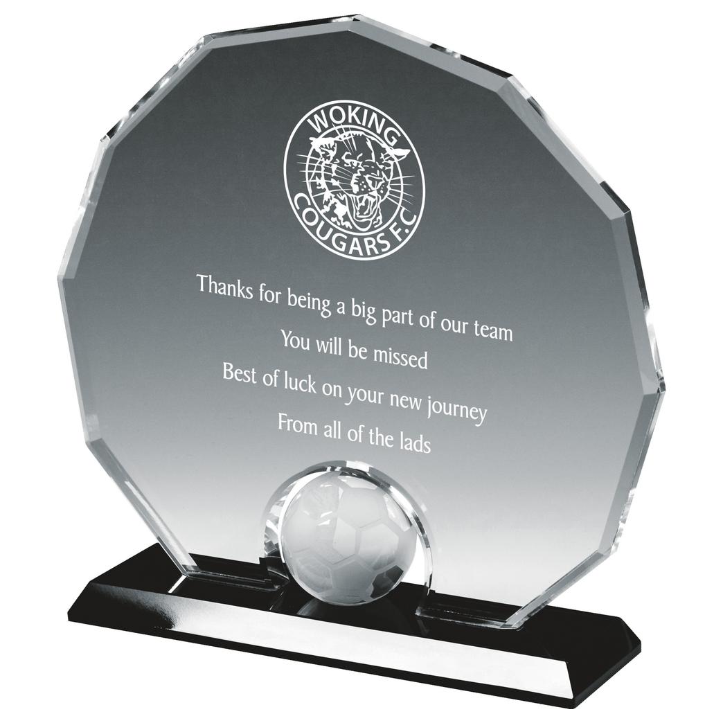This magnificent 18.5cm high football trophy is made of crystal and coloured clear. Sure to be received and displayed with joy. Plate engraving is FREE of charge on this product. Click customise and buy below to enter your engraving details.