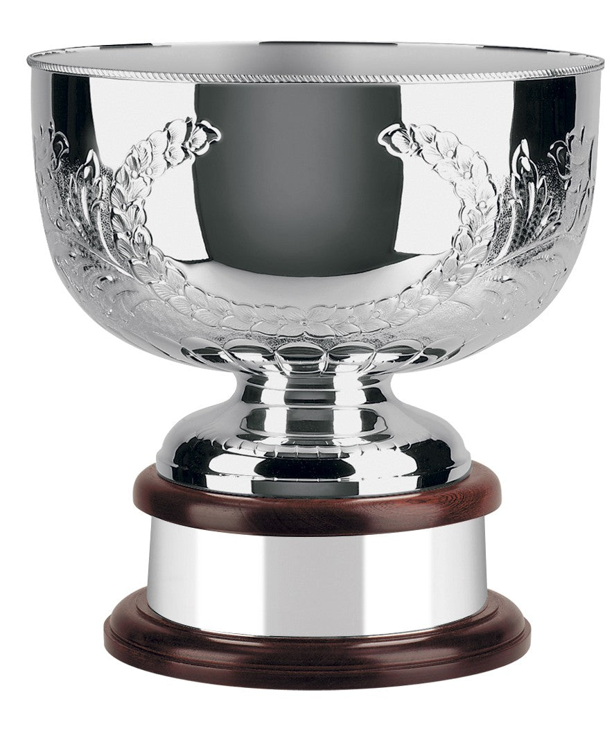 This hand chased silver plated bowl with laurel wreaths on the back and front is handcrafted in England, using traditional methods and only the finest materials. Features a decorative rope pattern around the rim. An exquisite award for a more superior event. Can be engraved with any inscription on the body or the plinth band. Supplied with a lifetime warranty and is available in 1 size only.