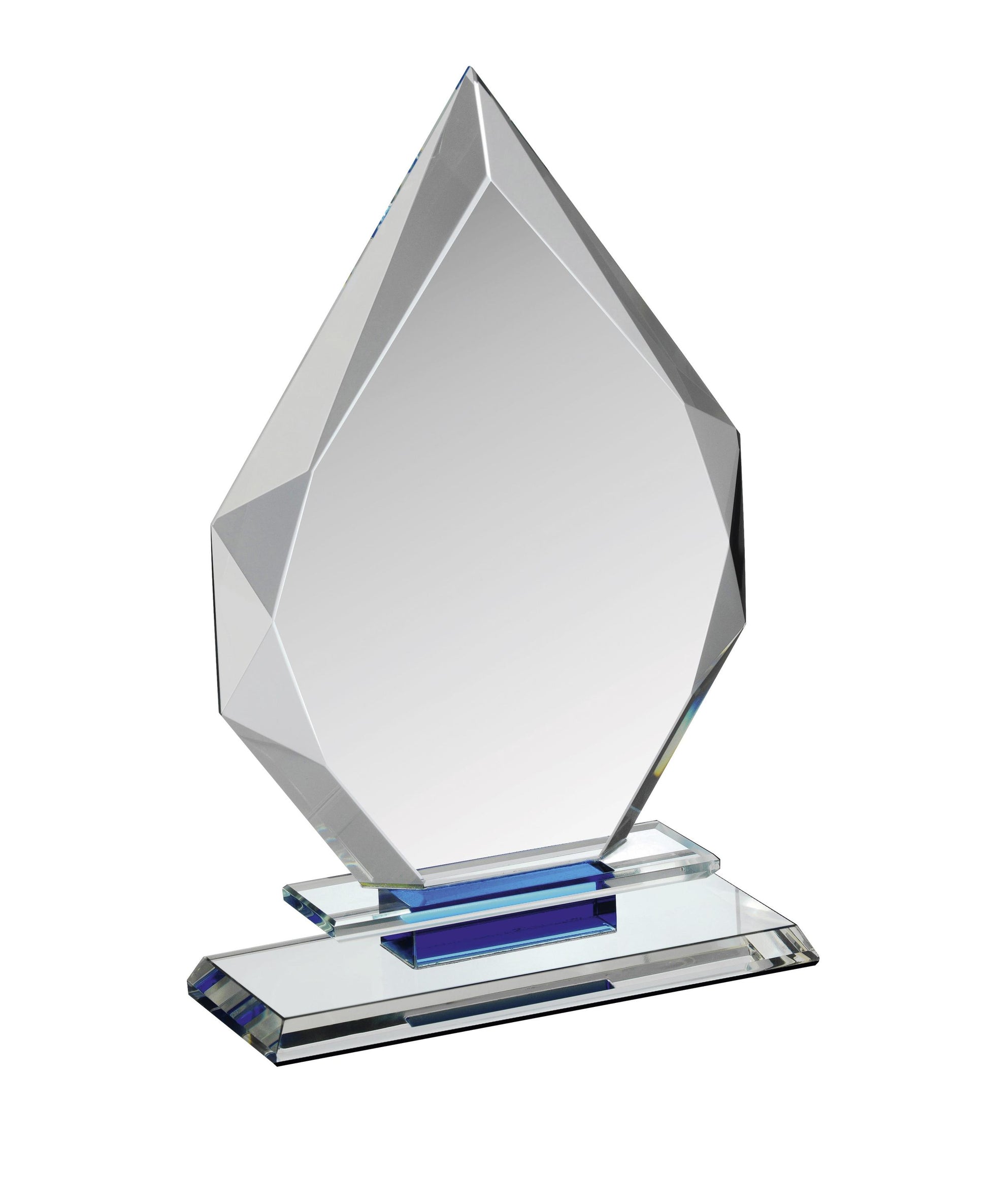 This crystal glass award is crafted into an elegant teardrop design, featuring an engraving area for a personalised message of your choice. It is set on a thick base, which comprises of two clear glass rectangular stands with an eye-catching bold blue glass divide.This product is available in three sizes and is supplied in a blue Swatkins crystalware presentation box.