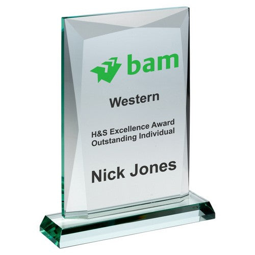 This 203mm high jade Jade Glass jade plaque award is the perfect trophy for any all purpose star. It will be received and displayed with pride. This award can be engraved with a message of your choice and is included in the award price, so you have nothing extra to pay.