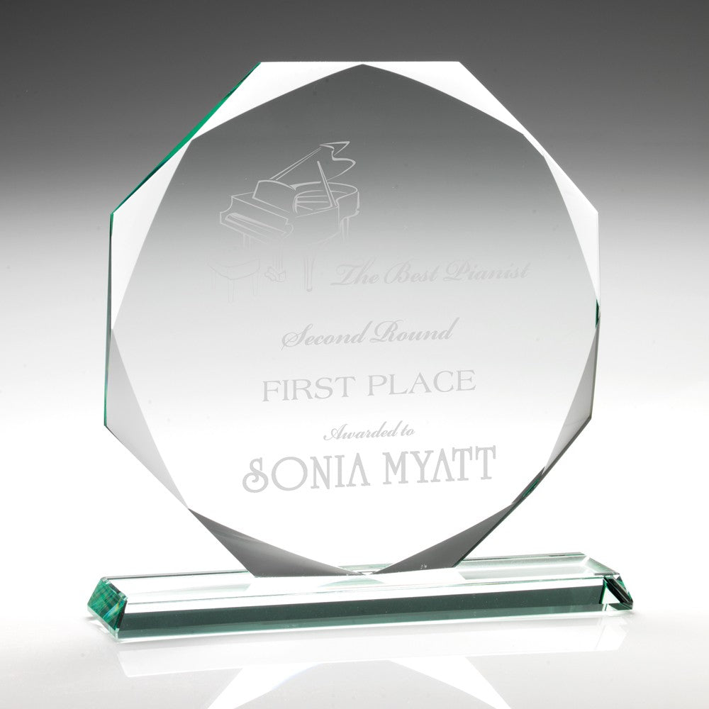 An award fit for any superstar. This 14.5cm high delightful jade glass plaque is bound to be treasured. It will be received and displayed with pride. Upload a logo or club emblem, which can be applied to the award as well as text.