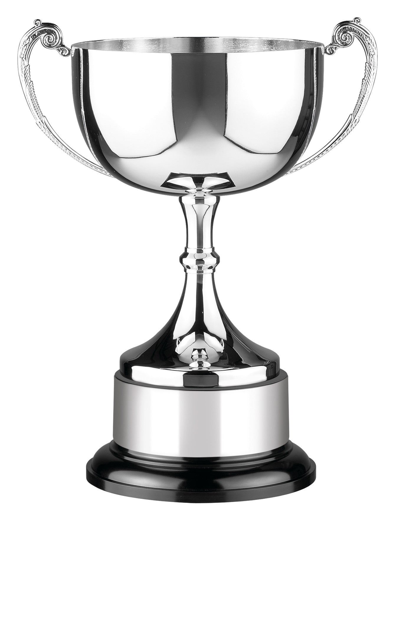 The wide bowl design of this nickel plated cup makes for a striking award. The cup stands on a black Bakelite base and features elegant patterned handles. The body of this beautiful item can be engraved with your text and is available in 4 sizes. The optional base band can be added to your order and used to engrave annual award winners.