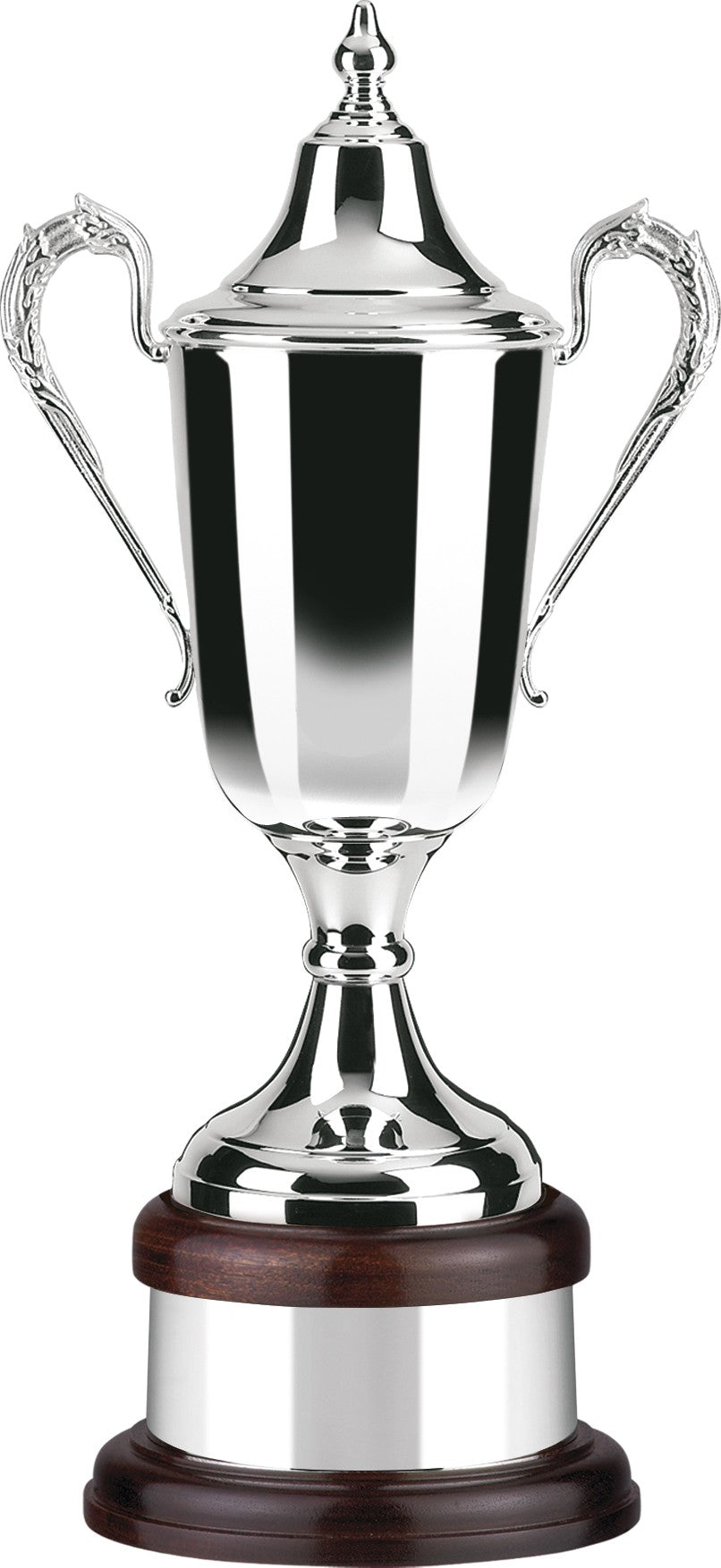 The FORMULA SUPREME range is available in a plain or hand chased version. (please see L590 series for the hand chased version) The plain version is an elegant silver plated cup, complete with hand chased patterned handles, mahogany base and plinth band. The body of the cup is perfect for engraving your text. Available in three sizes.