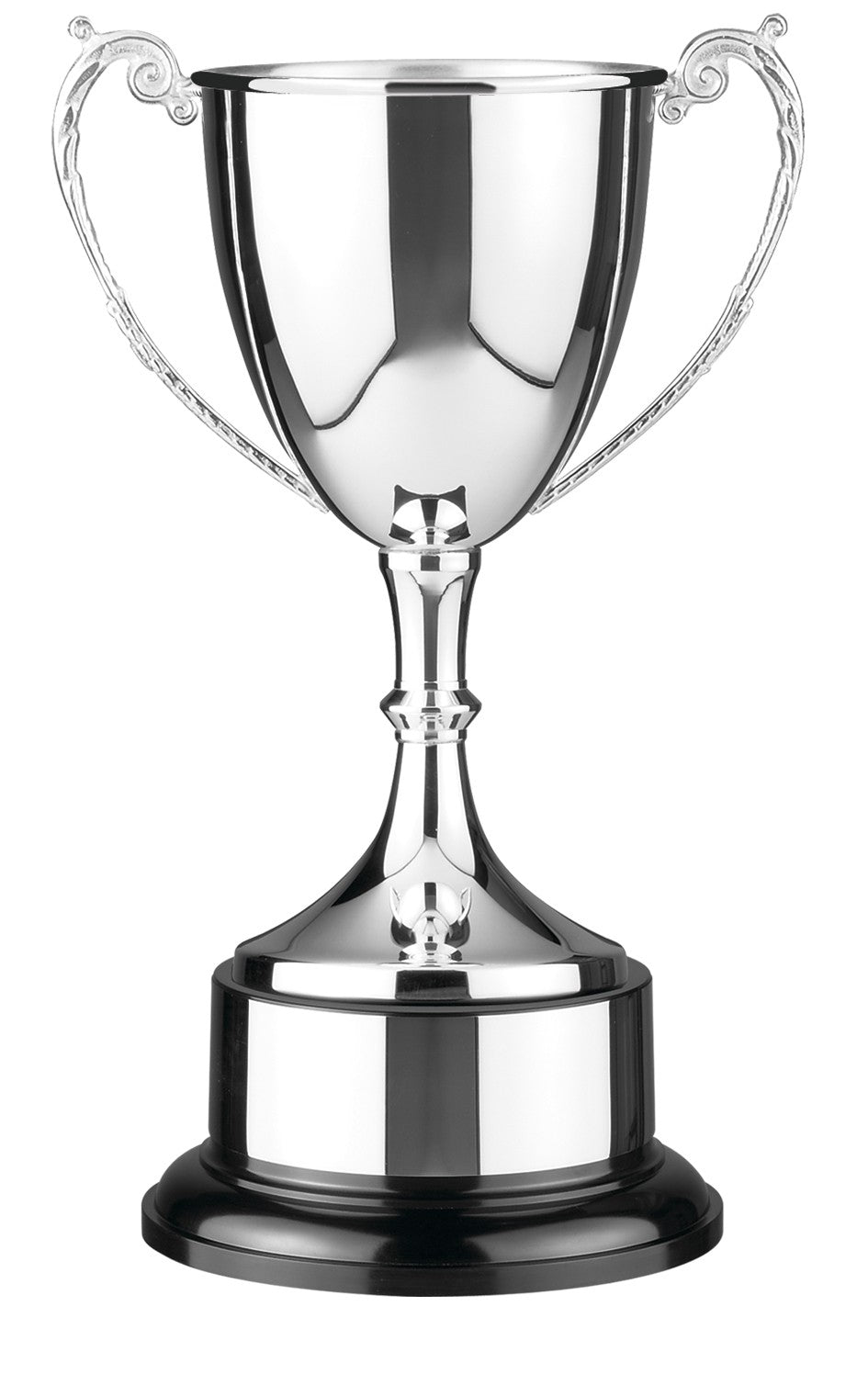 A stylish silver plated trophy perfect for any awards ceremony. Sits on a Bakelite base with ornate handles. Can be personalised with any text. and comes with an optional plinth band.