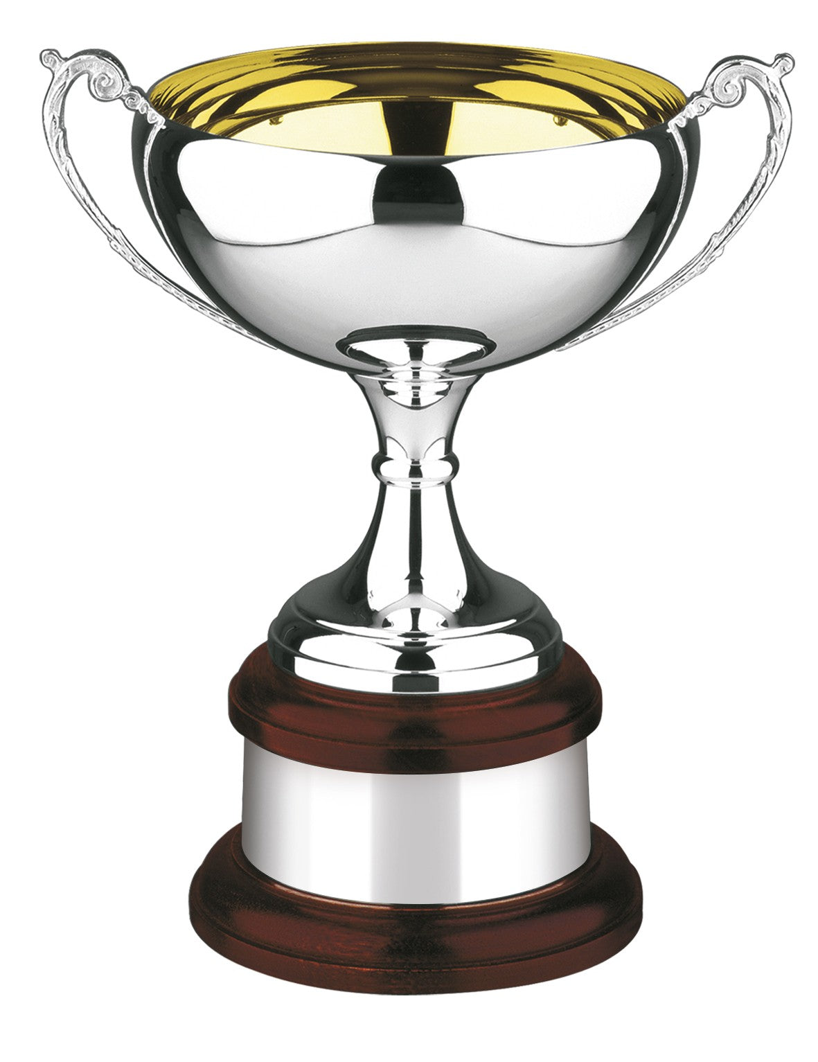Handcrafted in Britain with the finest of materials stands this prestigious silver plated cup with gold inside. In the right light the gold colour is captured. With its wide body any text can be engraved of your choice. Supplied complete with plinth band and mahogany base.
