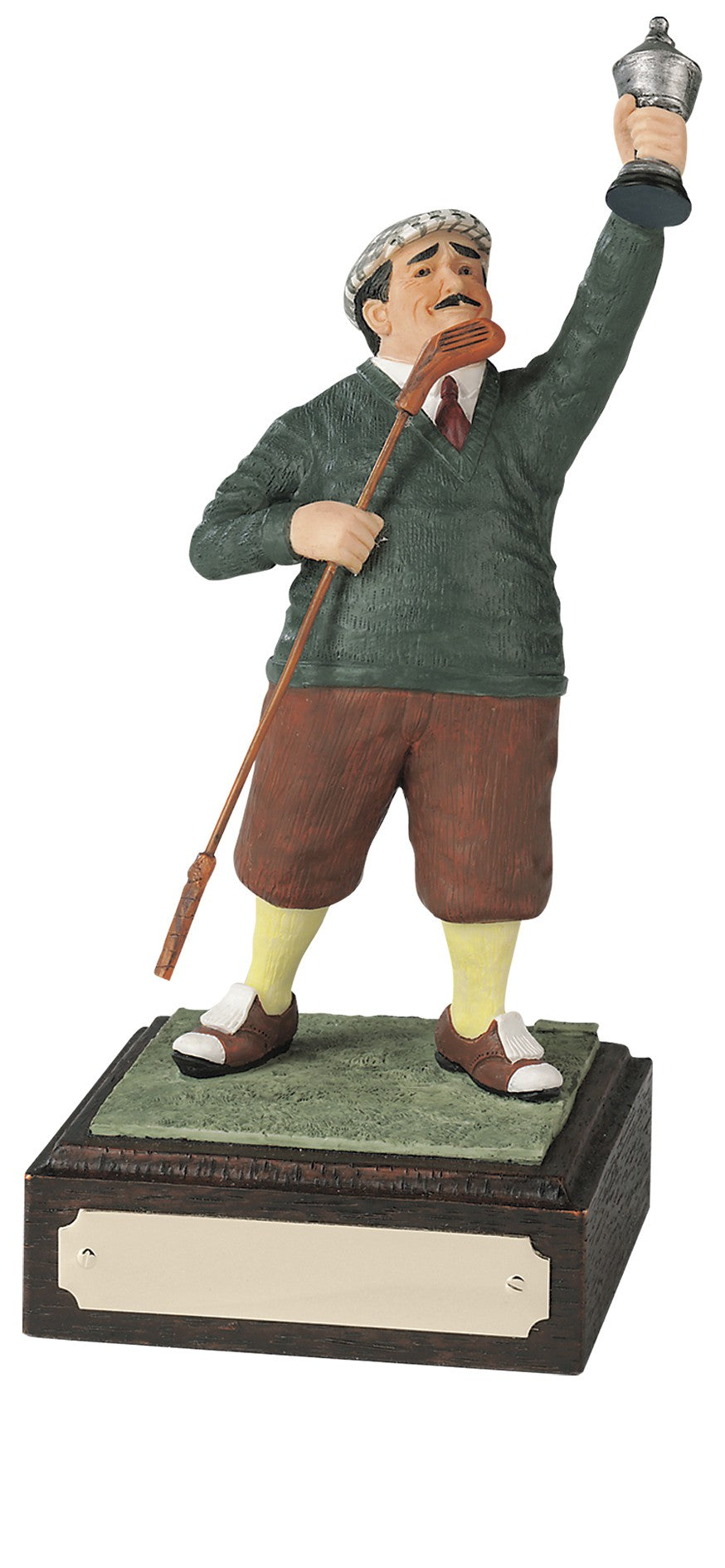 This antique gold finished male football resin features the player in possesion of the ball looking as if he is just about to side step one of the opposing teams player.